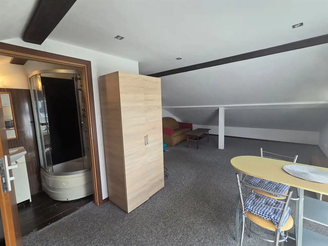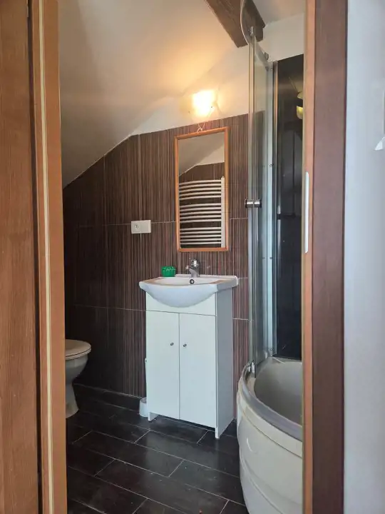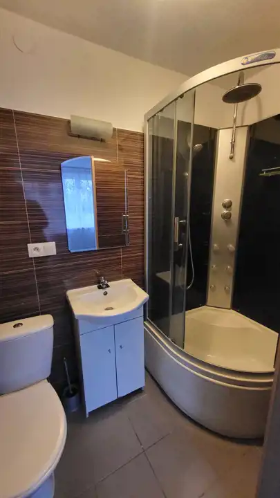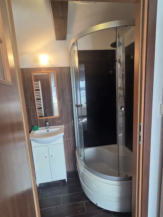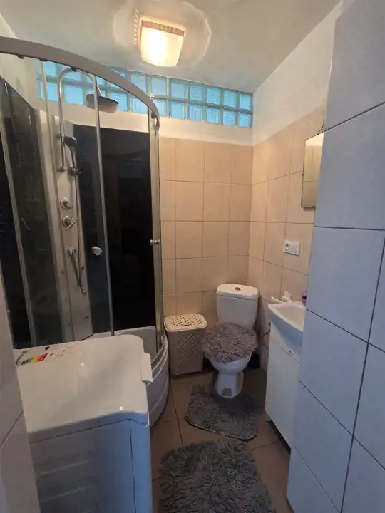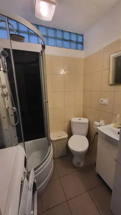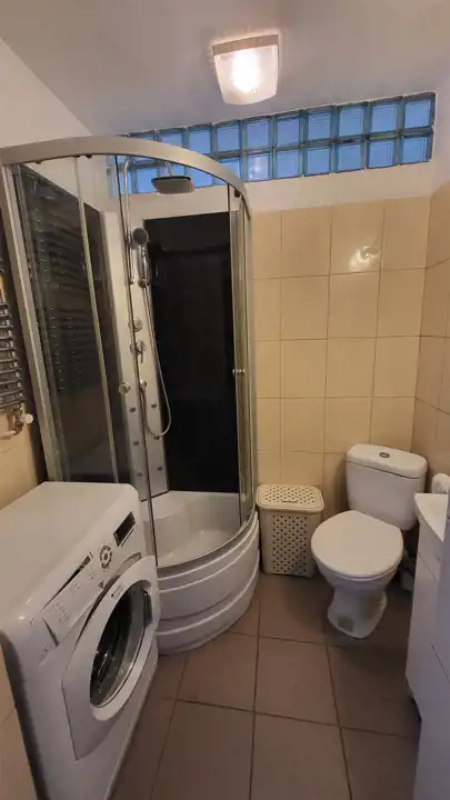 - łazienka z prysznicem, z pralką