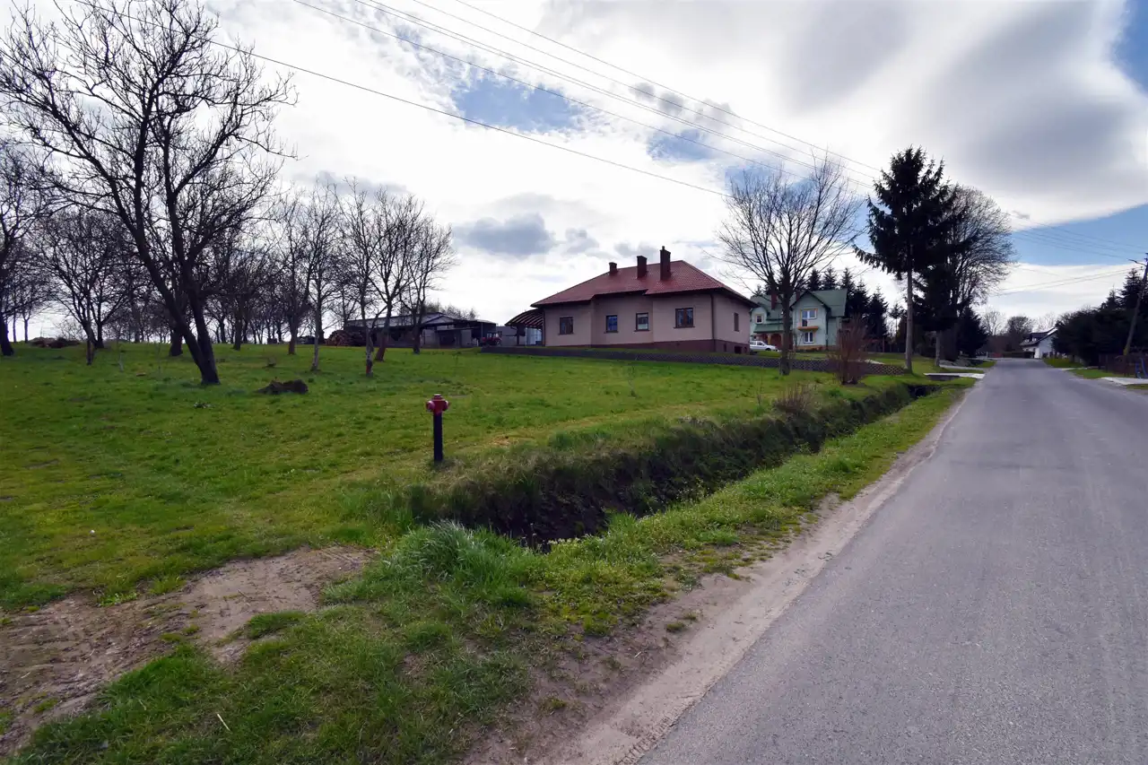 Działka w pierwszej linii zabudowy, przy lokalnej drodze asfaltowej.