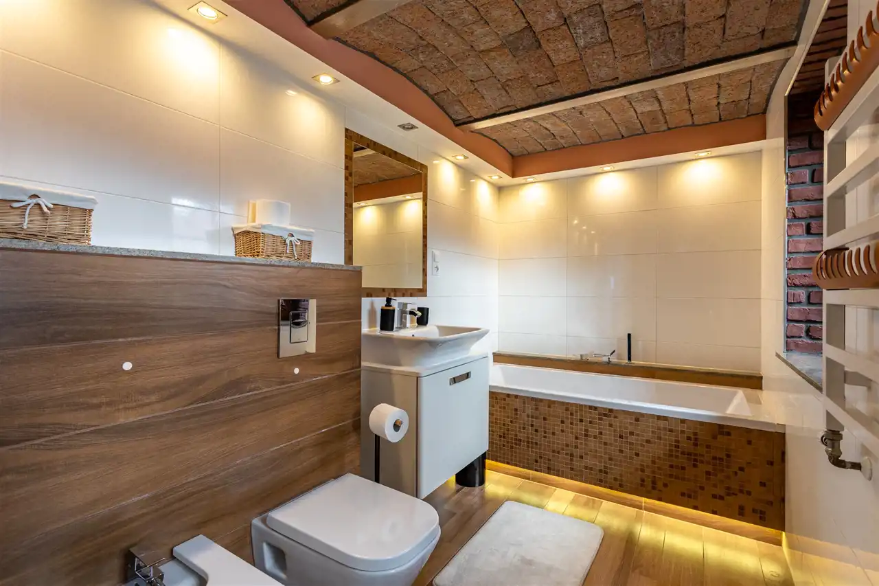 Kondygnacja -1: duża i przestronna łazienka, wyposażona w kabinę, wannę, wc, bidet oraz umywalkę. Jest tu również schowek na narty/rowery i kotłownia.