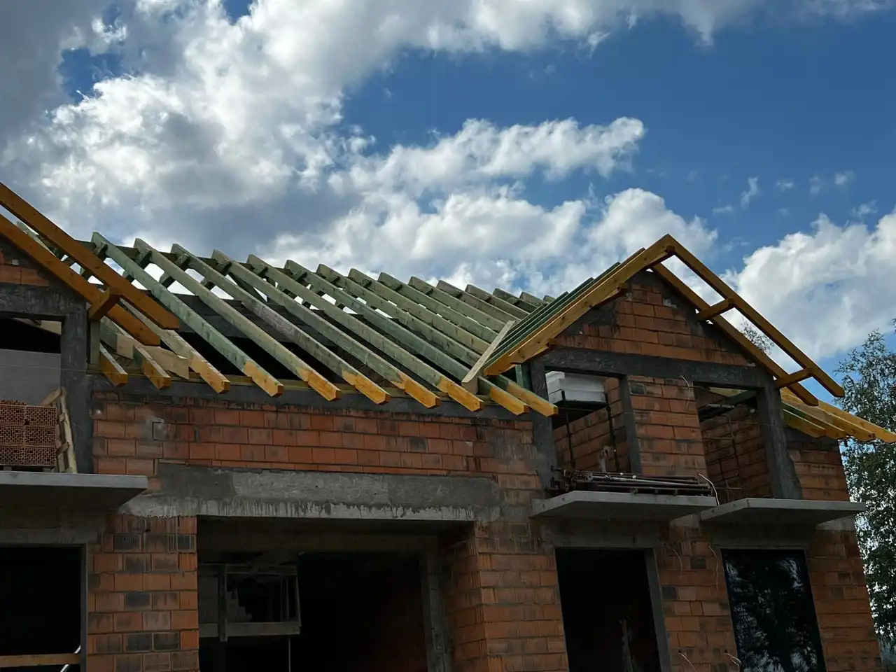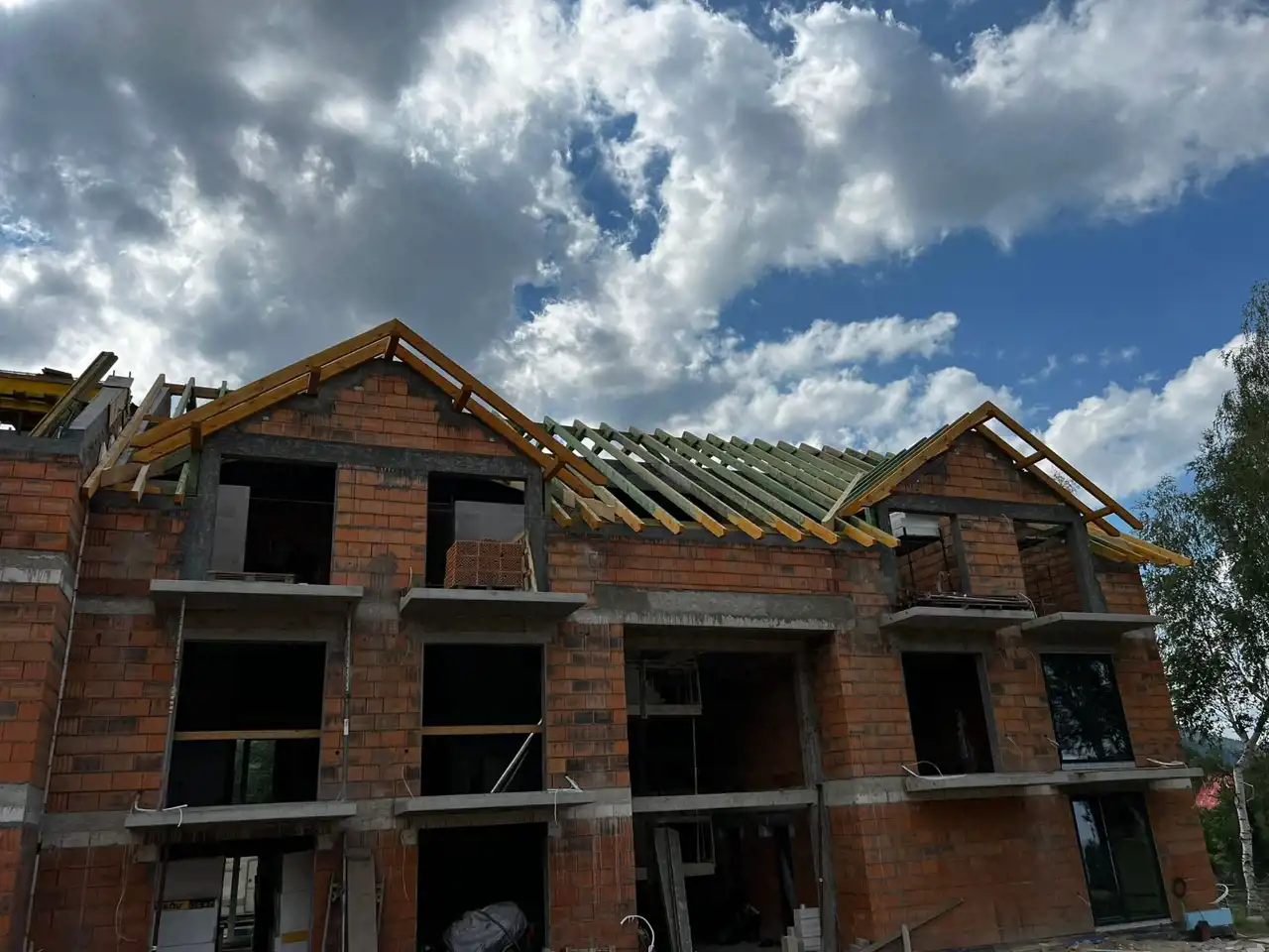 Dach konstrukcja dachu z wiązarów prefabrykowanych lub tradycyjna więźba dachowa, wykonany z tarcicy suszonej, impregnowanej, 4-stronnie struganej klasy C24, laty i kontrłaty drewniane impregnowane dachówka falista lub prosta w kolorze antracytowym lub czarnym pasującym do stylizacji osiedla