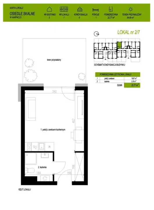 - Charakterystyka mieszkania 22.77 m2, 1 pokój