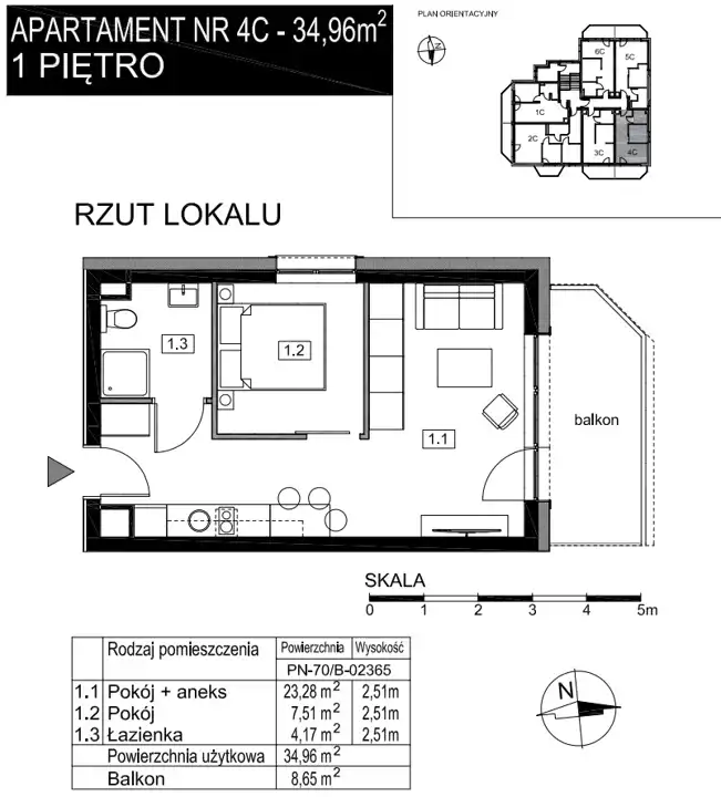 Na mieszkanie o powierzchni 34,96m2 składa się: