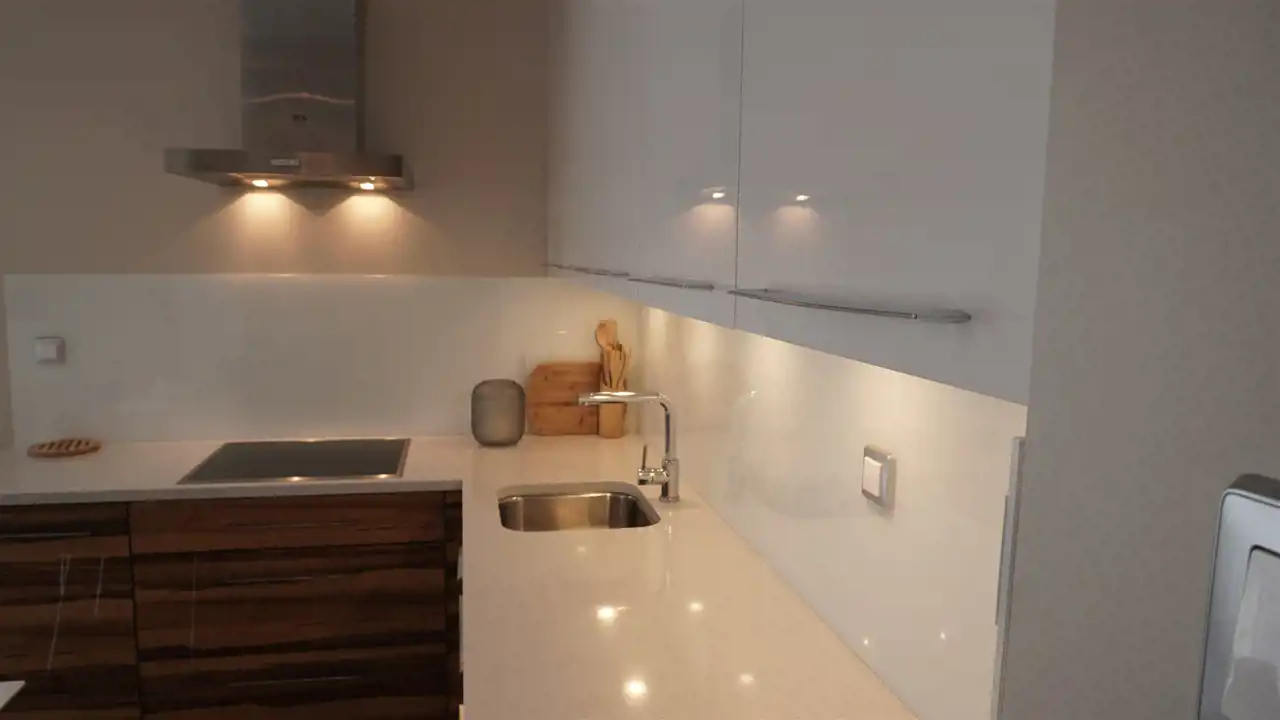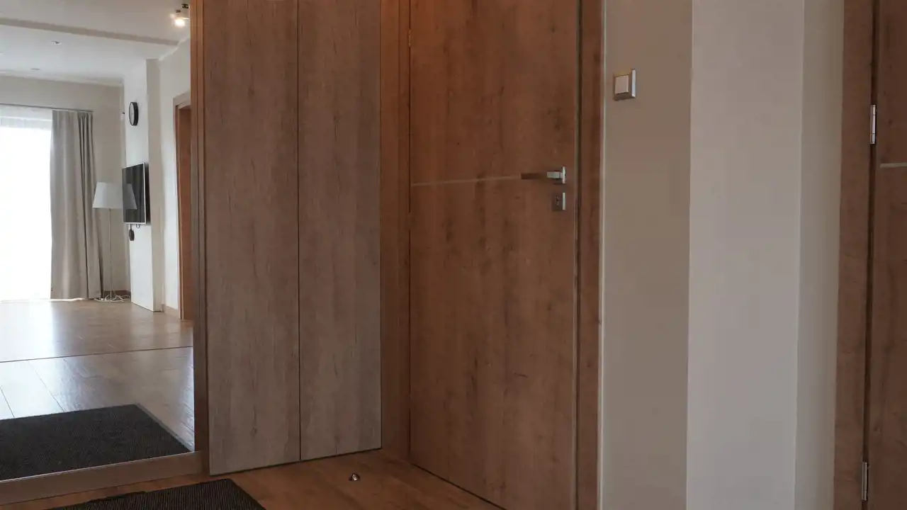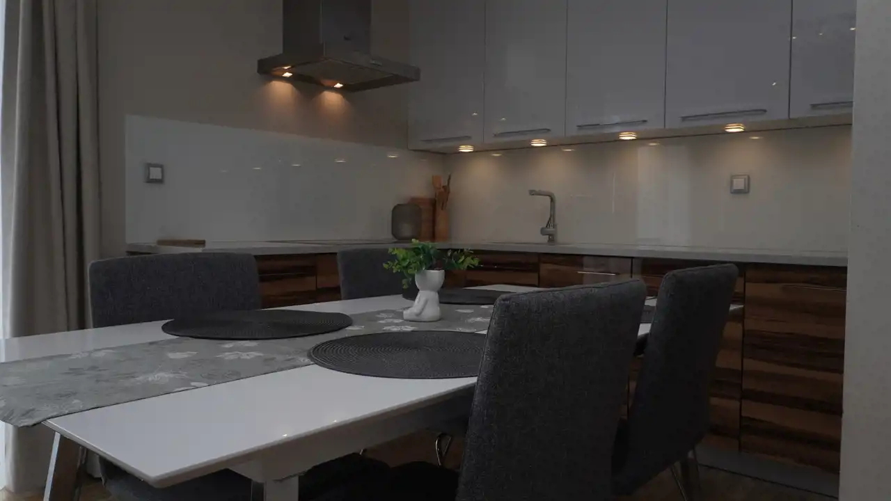 Wnętrza są ciepłe i przestronne. Po wejściu do lokalu znajduje się hall przy którym jest garderoba, następnie aneks kuchenny z jadalnią i częścią salonu. Osobna sypialnia z łóżkiem małżeńskim i dużą szafą. Łazienka przestronna, jasna wyposażona w armaturę wysokiej klasy. W kuchni zarówno blaty jak i armatura wysokiej markowych producentów.