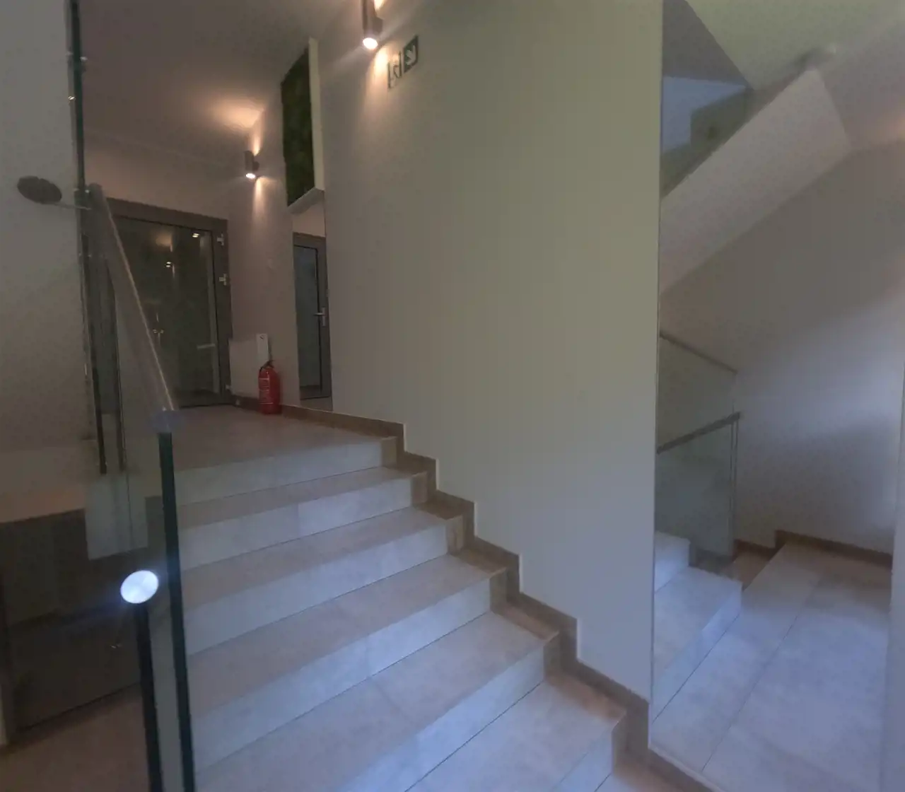 Budynek nowy, kameralny, części wspólne są bardzo zadbane i dobrze wyposażone ( barierki szklane, lustra, przytłumione oświetlenie nadające charakteru )