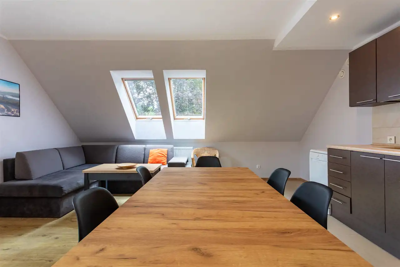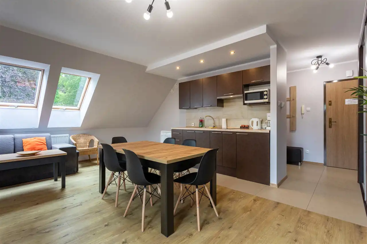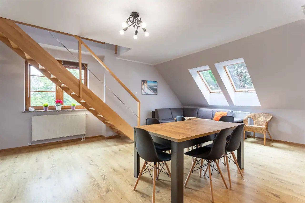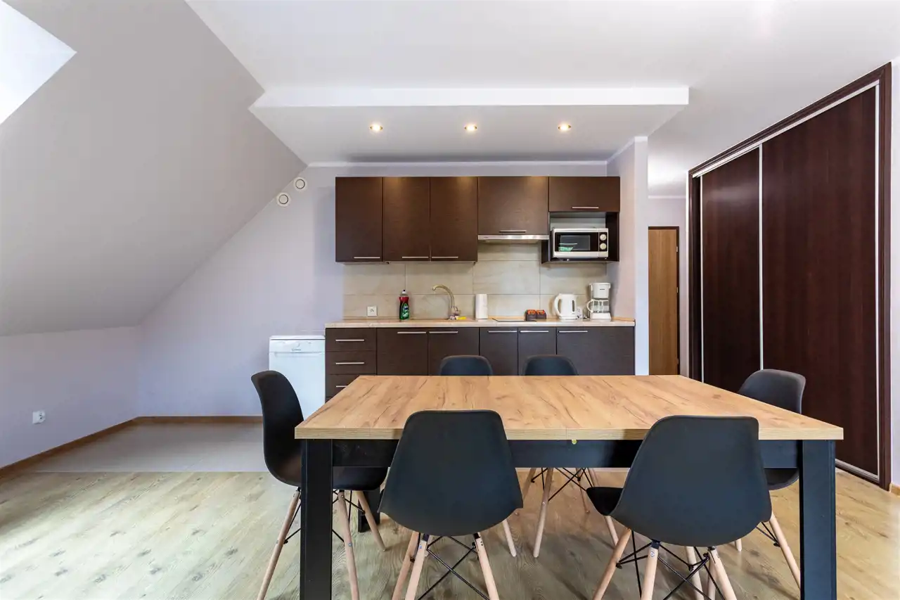 Na pierwszym poziomie lokalu znajduje się wygodny przedpokój z zabudowaną szafą, łazienka oraz otwarta strefa dzienna – jasna i przestronna, z doskonale doświetlonym salonem, rozkładanym narożnikiem, dużym stołem jadalnianym oraz funkcjonalnym aneksem kuchennym. Drugi poziom mieści dwie oddzielne sypialnie, zapewniając pełną prywatność i komfort użytkowania. Całość została przemyślana tak, aby bez problemu pomieścić 6 osób, co daje przewagę nad większością mniejszych lokali w okolicy, które standardowo przyjmują maksymalnie 4 gości.