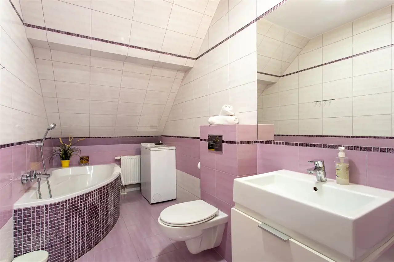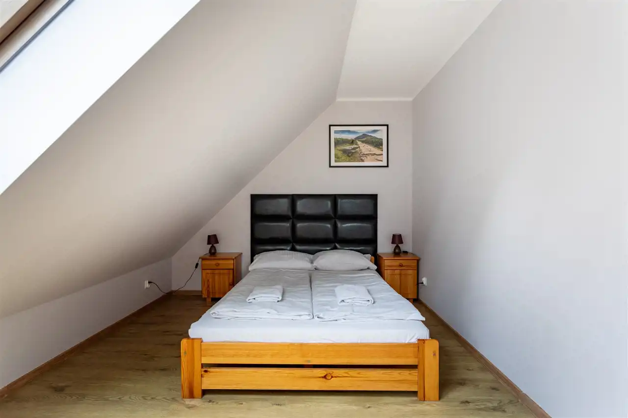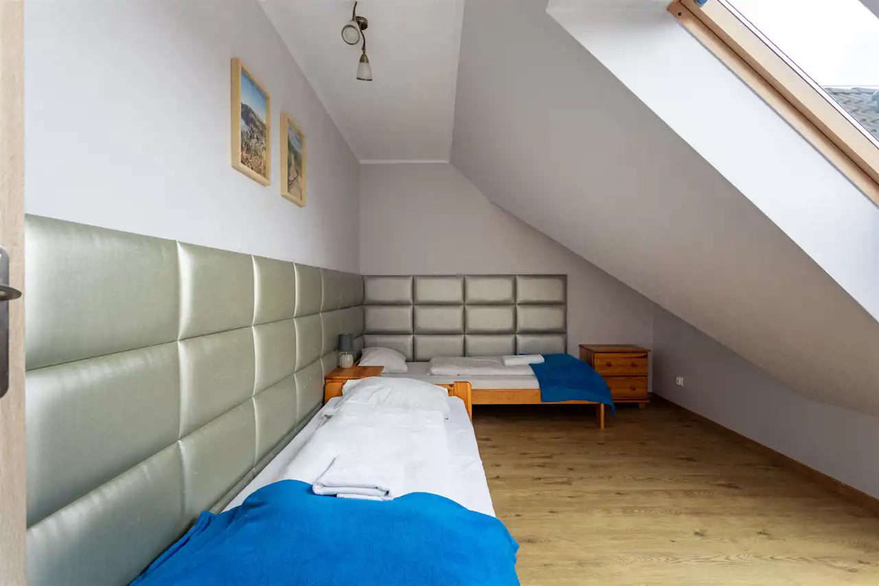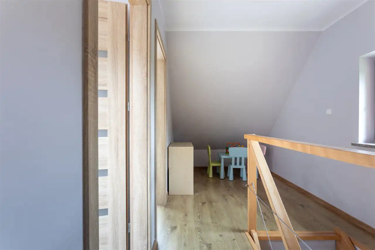 Na pierwszym poziomie lokalu znajduje się wygodny przedpokój z zabudowaną szafą, łazienka oraz otwarta strefa dzienna – jasna i przestronna, z doskonale doświetlonym salonem, rozkładanym narożnikiem, dużym stołem jadalnianym oraz funkcjonalnym aneksem kuchennym. Drugi poziom mieści dwie oddzielne sypialnie, zapewniając pełną prywatność i komfort użytkowania. Całość została przemyślana tak, aby bez problemu pomieścić 6 osób, co daje przewagę nad większością mniejszych lokali w okolicy, które standardowo przyjmują maksymalnie 4 gości.
