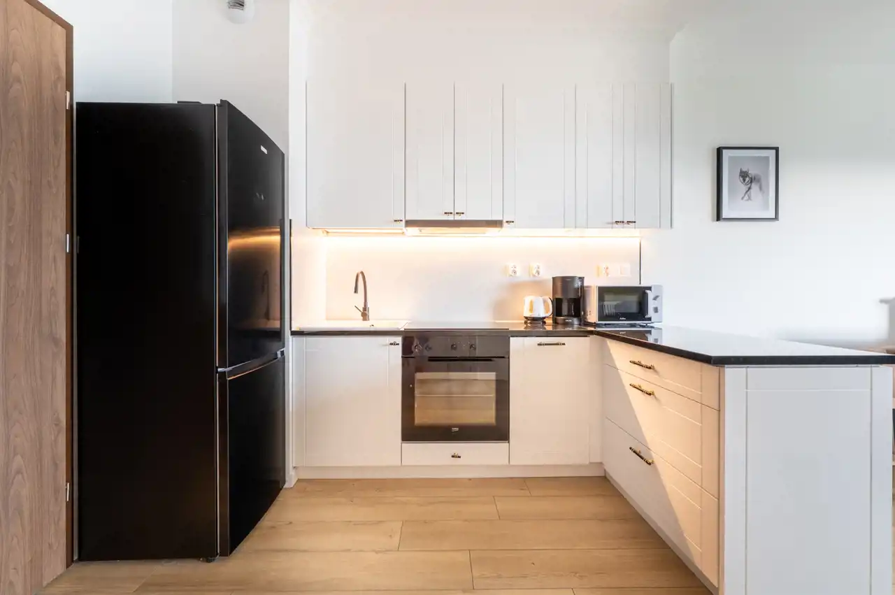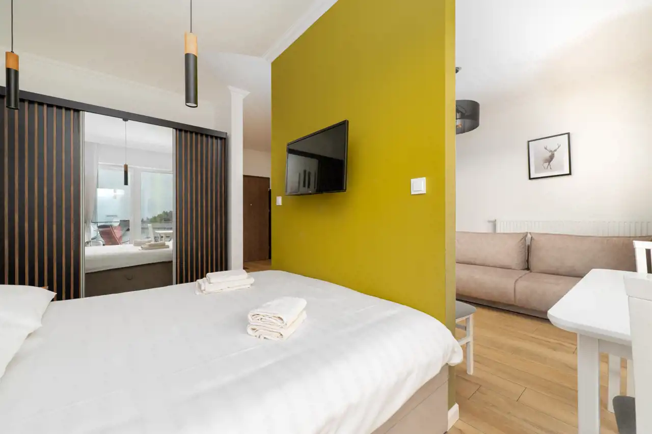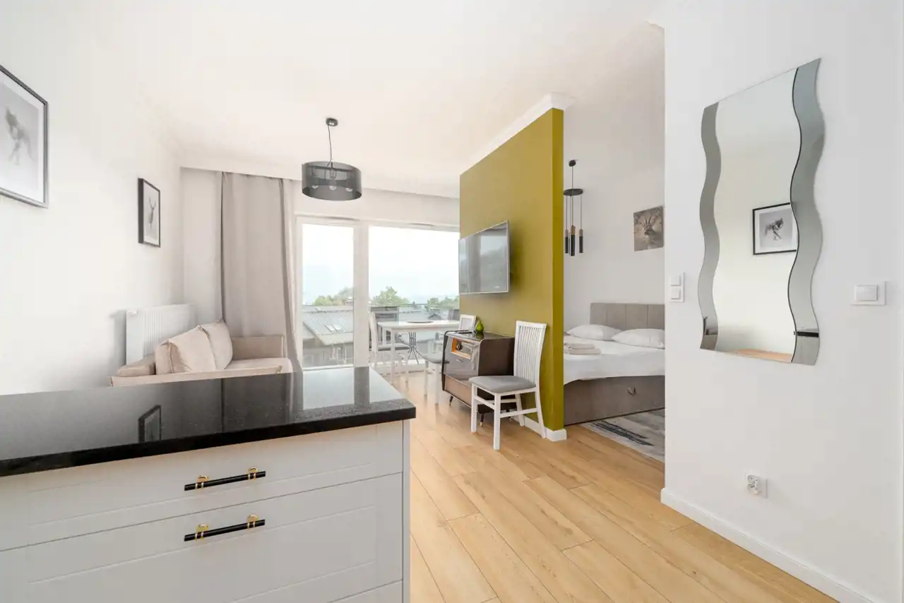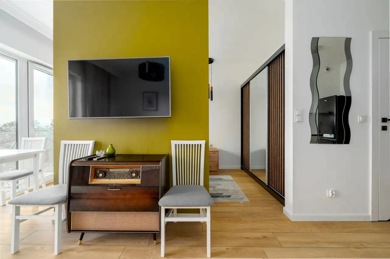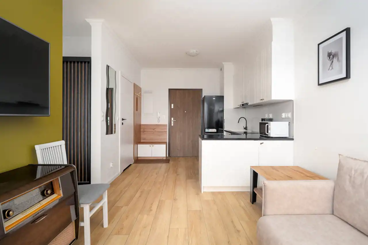 Mieszkanie jest w pełni wyposażone i gotowe do wynajmu od zaraz. Znajdziesz tu nowoczesne meble, sprzęt RTV i AGD.