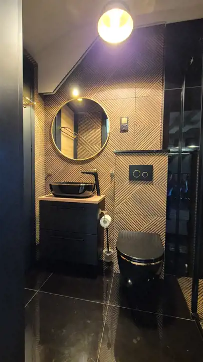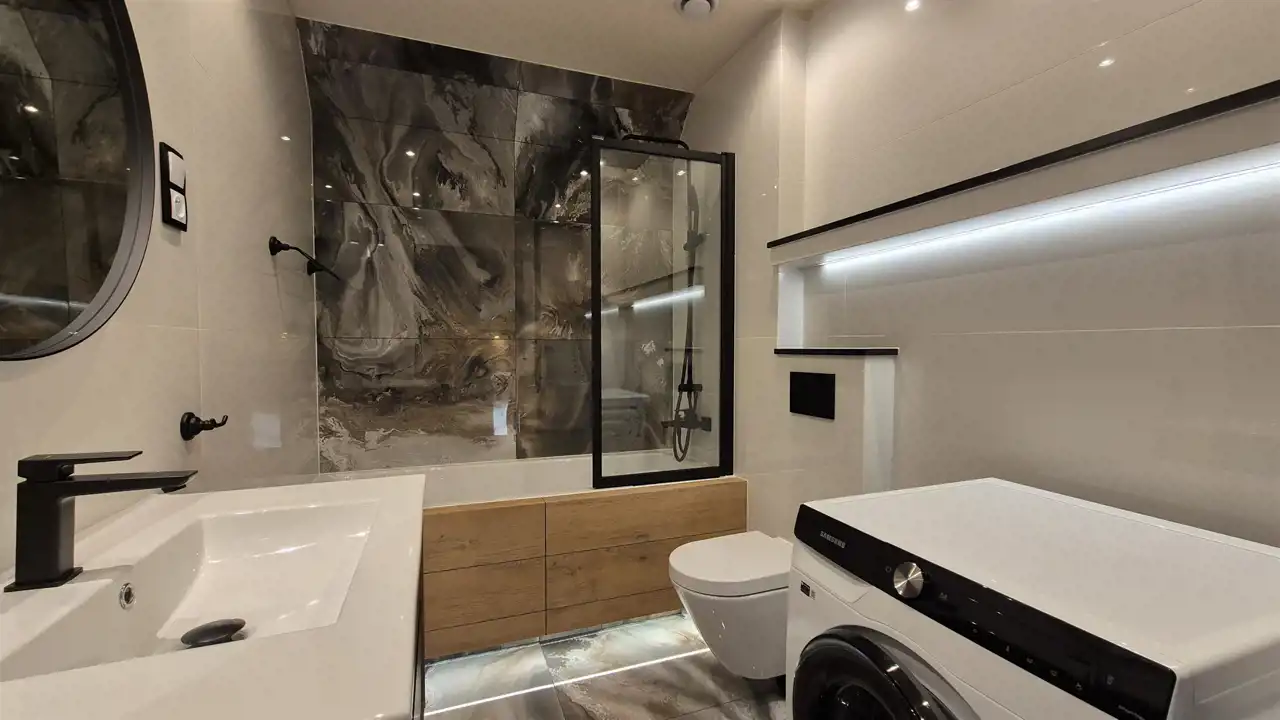 Łazienka - wanna z funkcją kabiny prysznicowej, umywalka, pralka, WC.
