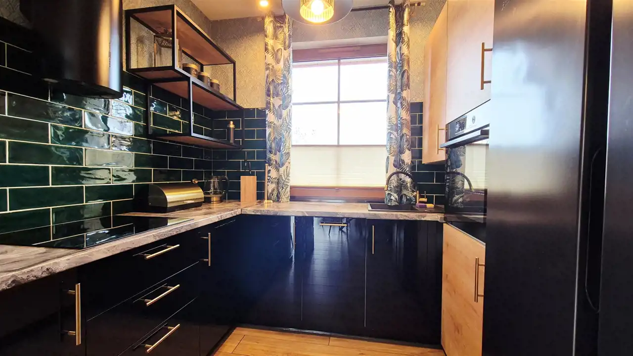 Kuchnia wyposażona w płytę indukcyjną, piekarnik elektryczny, zmywarkę ,lodówkę z zamrażarką i kostkarką do lodu, okap kuchenny.