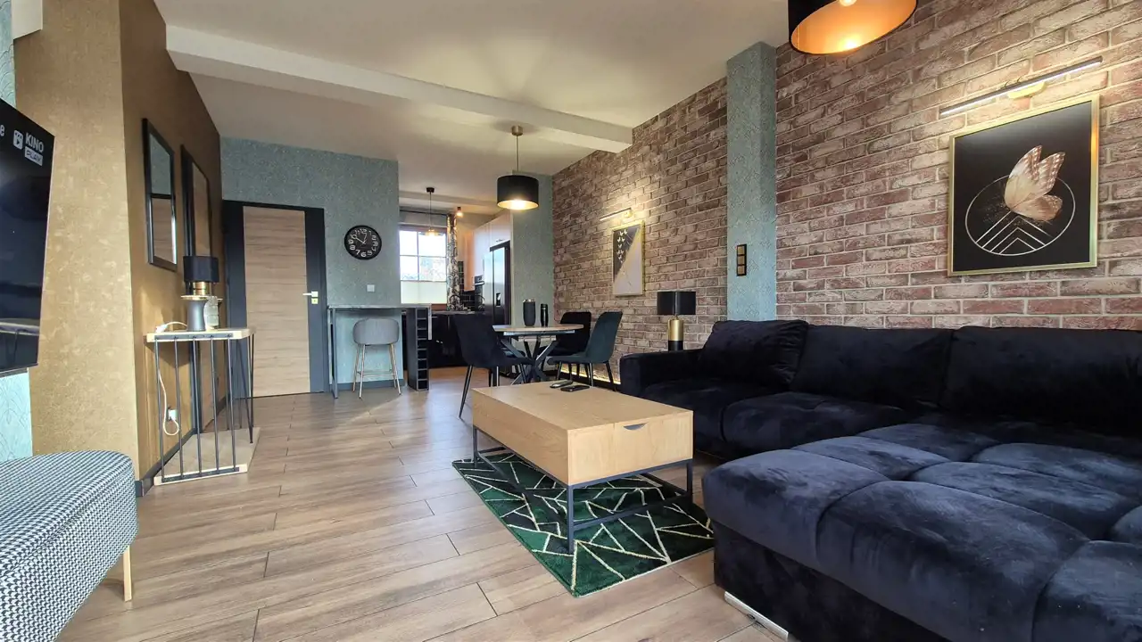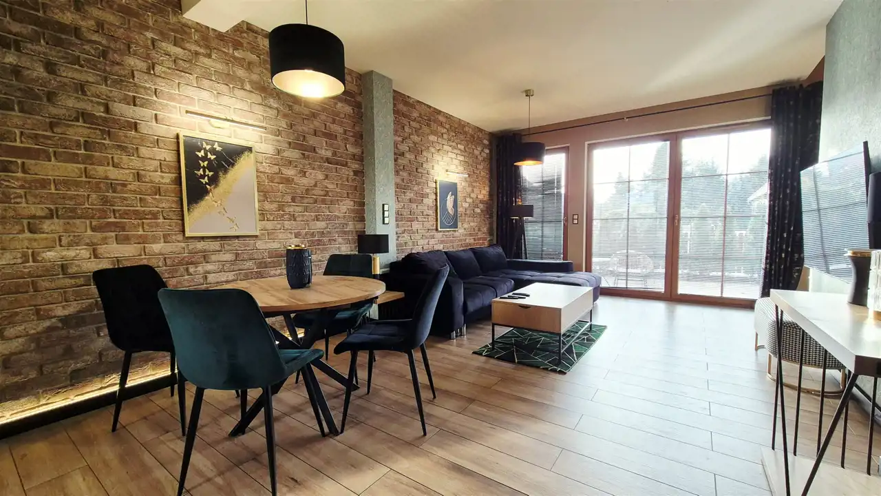 W salonie rozkładana kanapa, TV led 65 ", stół z krzesłami