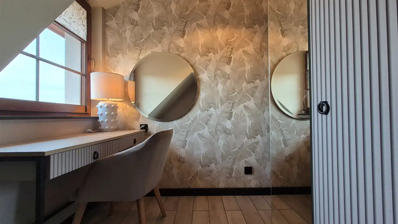 Na piętrze sypialnia z szerokim łóżkiem z wygodnym materacem, szafą