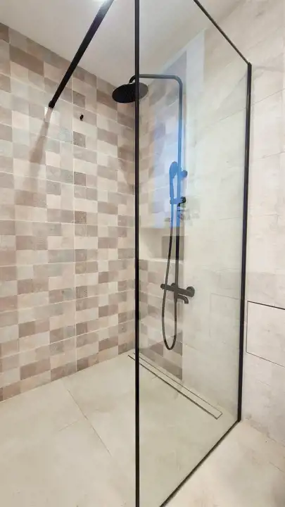- łazienka wykończona ekskluzywną ceramiką, z kabiną prysznicową, umywalką i toaletą
