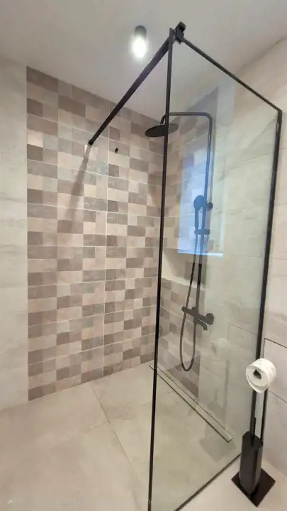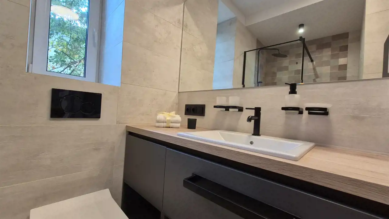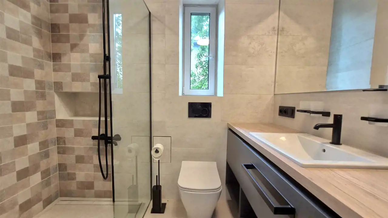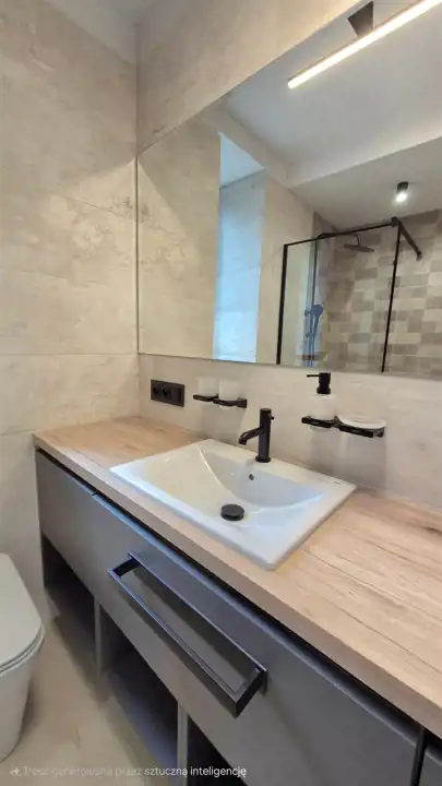 - łazienka wykończona ekskluzywną ceramiką, z kabiną prysznicową, umywalką i toaletą