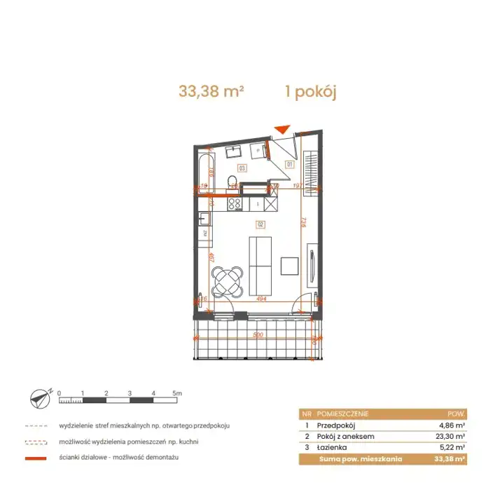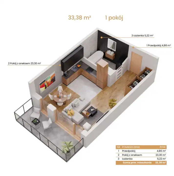- Charakterystyka mieszkania 33.38 m2, 1 pokój