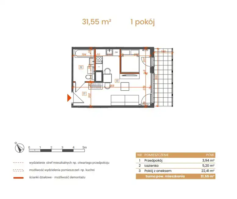 - Charakterystyka mieszkania 31.55 m2, 1 pokój