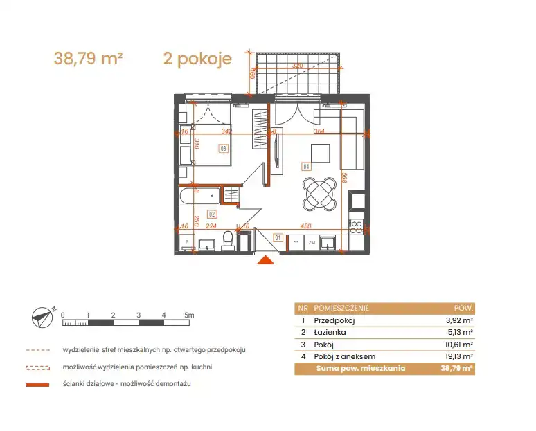 - Charakterystyka mieszkania 38.79 m2, 2 pokoje