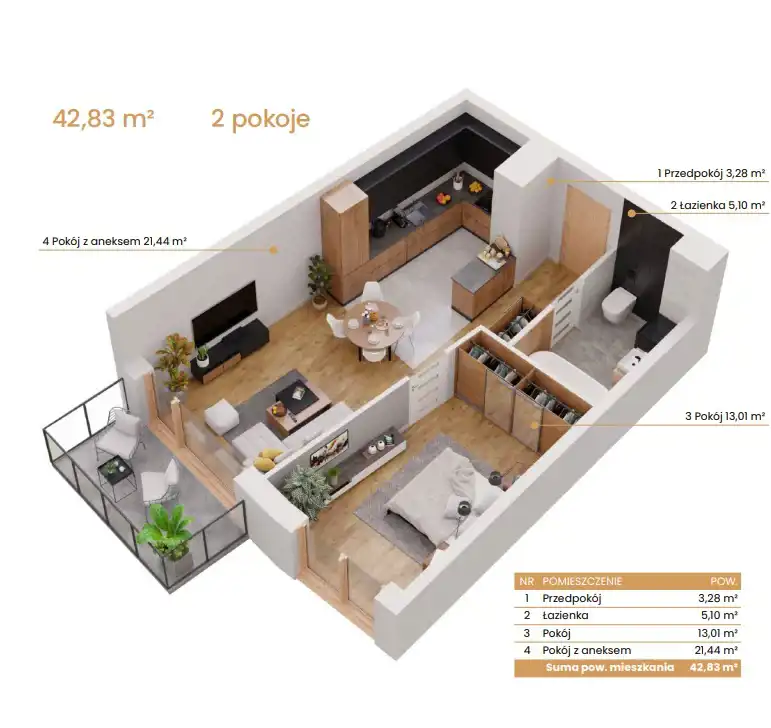 - Charakterystyka mieszkania 42.83 m2, 2 pokoje