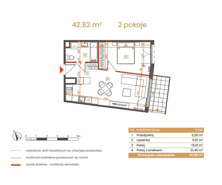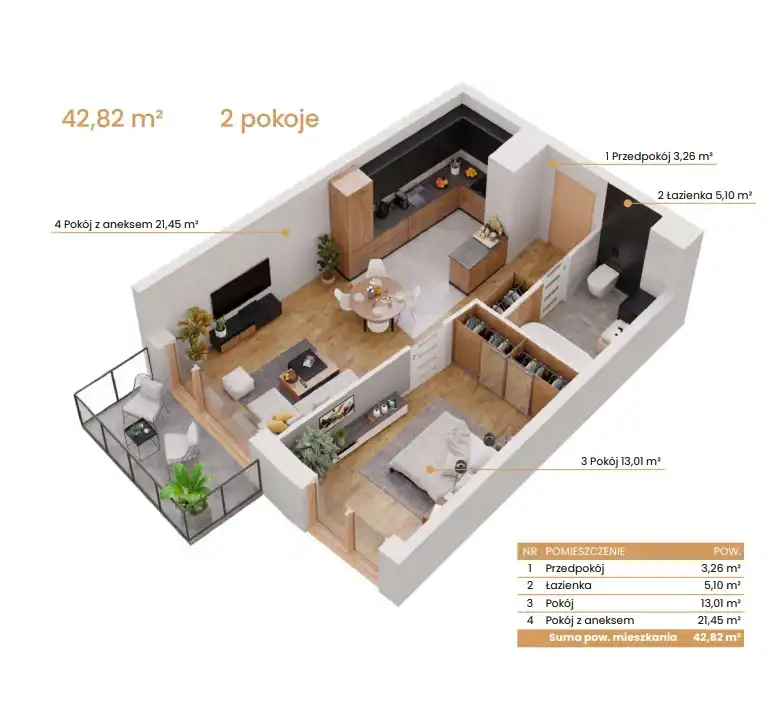 - Charakterystyka mieszkania 42.82 m2, 2 pokoje