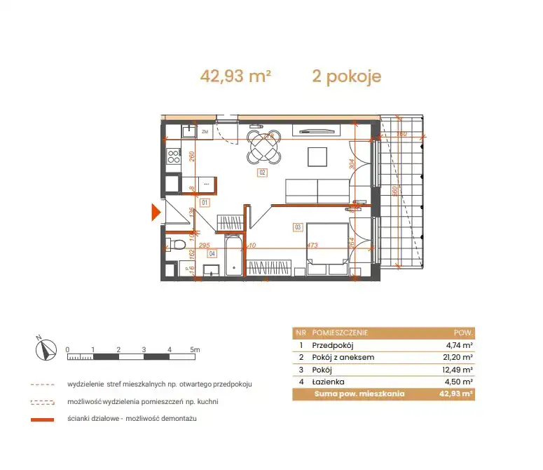 - Charakterystyka mieszkania 42.93 m2, 2 pokoje