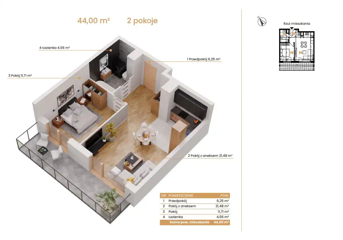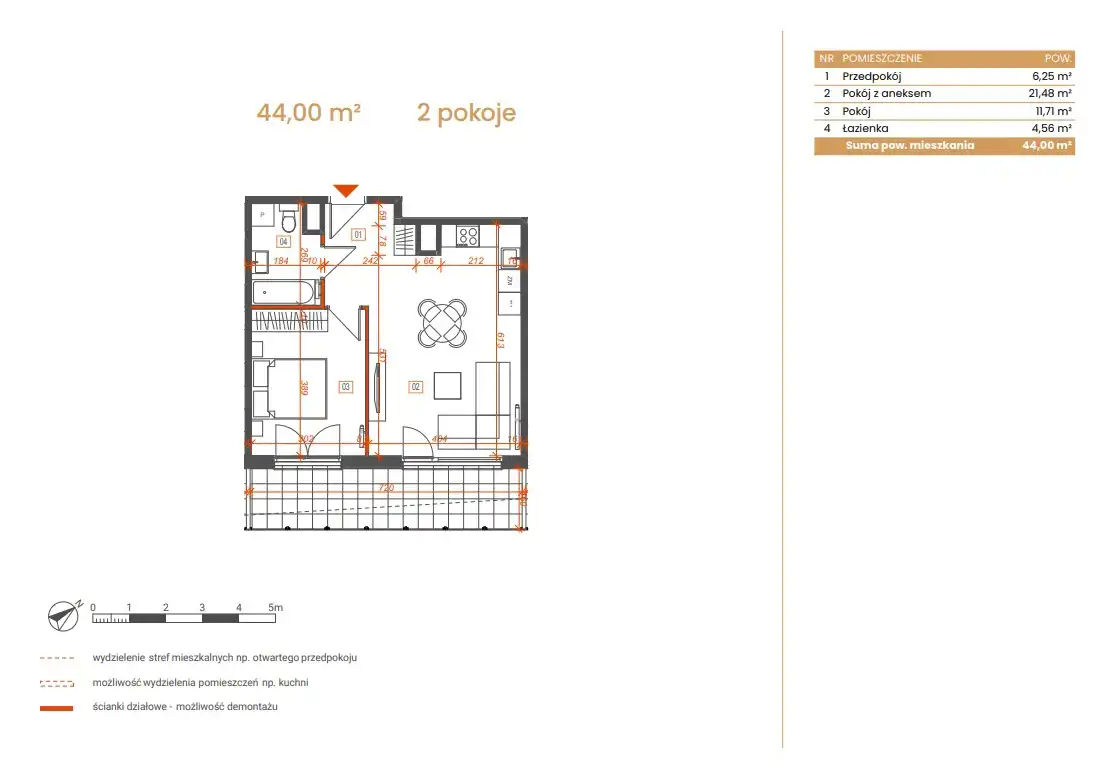 - Charakterystyka mieszkania 44 m2, 2 pokoje