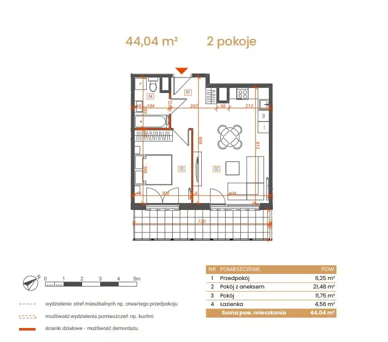 - Charakterystyka mieszkania 44.04 m2, 2 pokoje