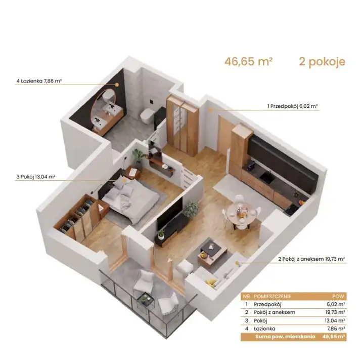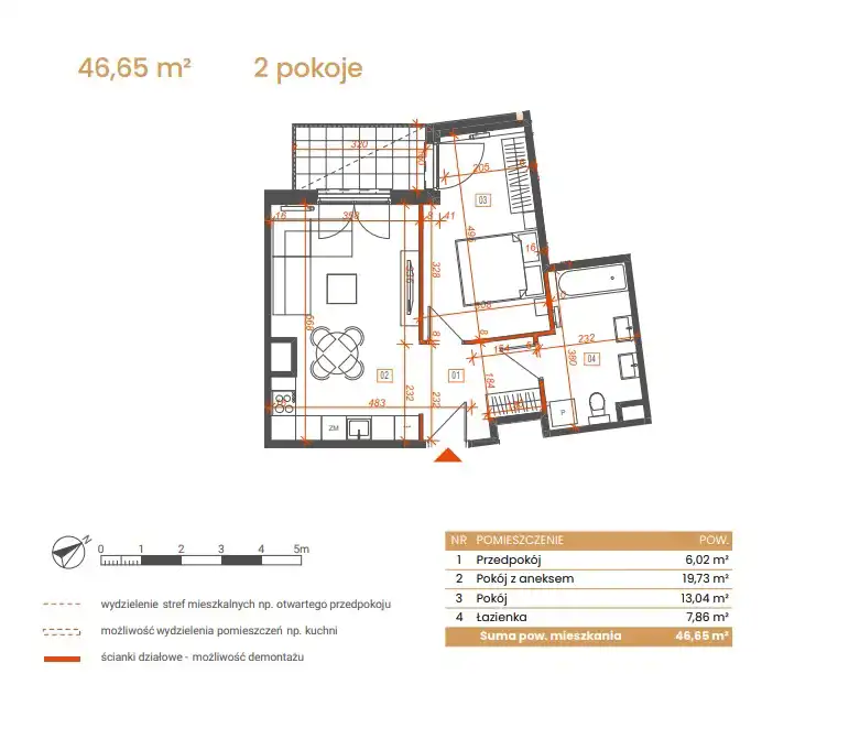 - Charakterystyka mieszkania 46.65 m2, 2 pokoje