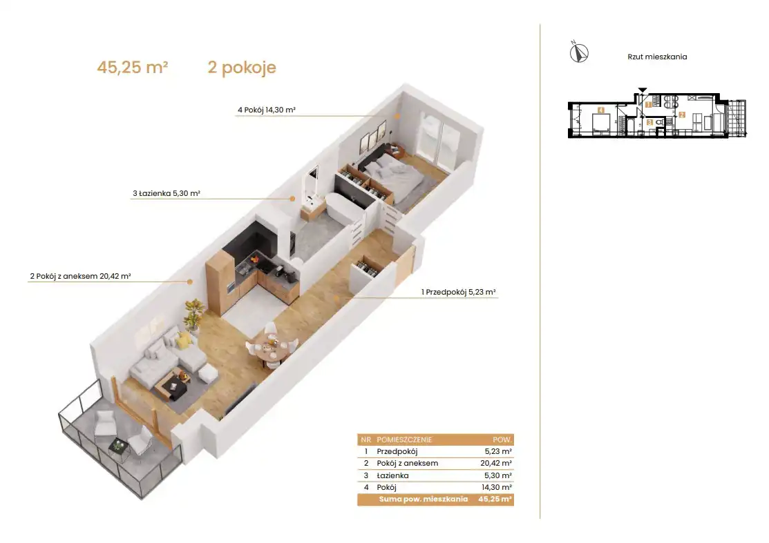 - Charakterystyka mieszkania 45.25 m2, 2 pokoje