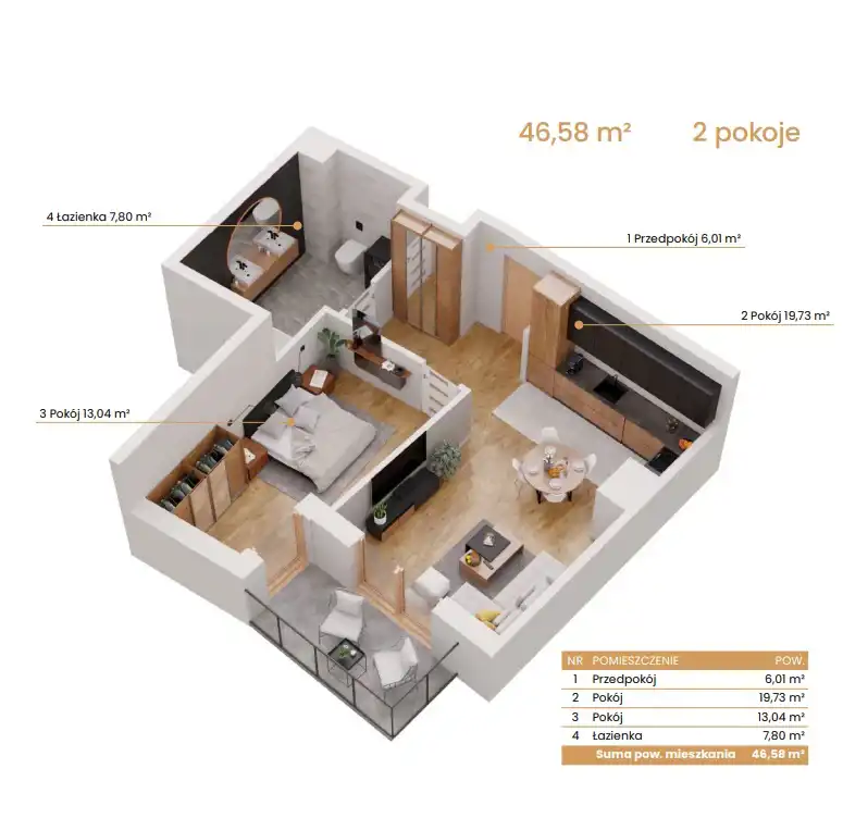 - Charakterystyka mieszkania 46.58 m2, 2 pokoje