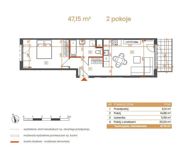 - Charakterystyka mieszkania 47.15 m2, 2 pokoje