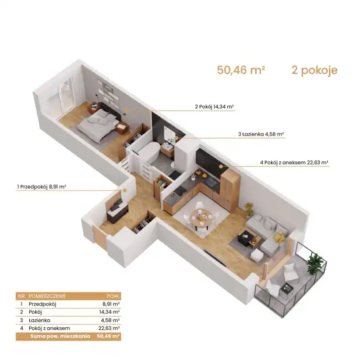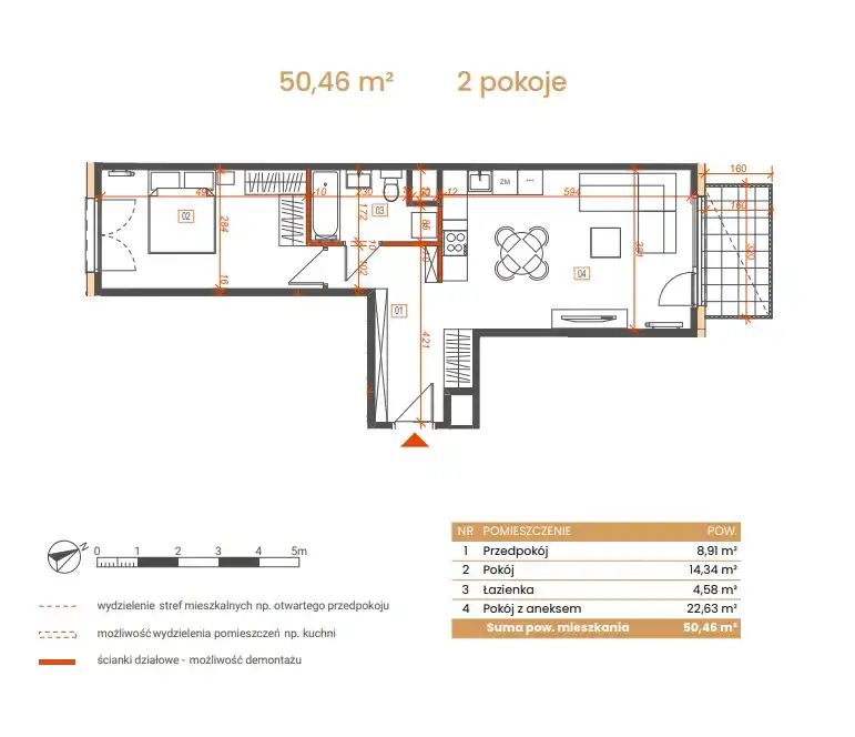 - Charakterystyka mieszkania 50.46 m2, 2 pokoje