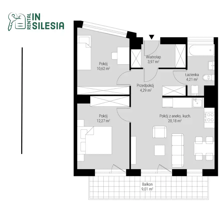 - Balkon (9 m²) – idealny do relaksu na świeżym powietrzu.