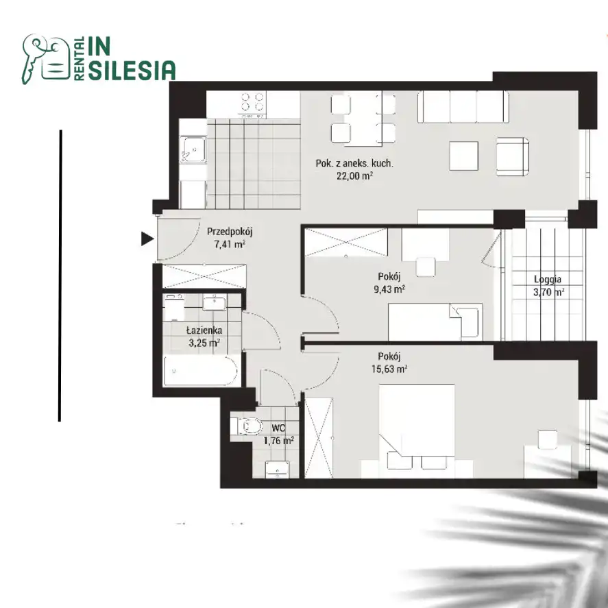Salon z aneksem kuchennym: Przestronny salon o powierzchni 22 m² połączony z aneksem kuchennym. . Aneks kuchenny przygotowany do montażu własnych mebli i sprzętów AGD. Duże okna prowadzące na loggie, która zapewnia dodatkową przestrzeń do relaksu.Sypialnia główna: Komfortowa sypialnia o powierzchni 15 m², z miejscem na duże łóżko. Duże okna zapewniają odpowiednie doświetlenie pomieszczenia.