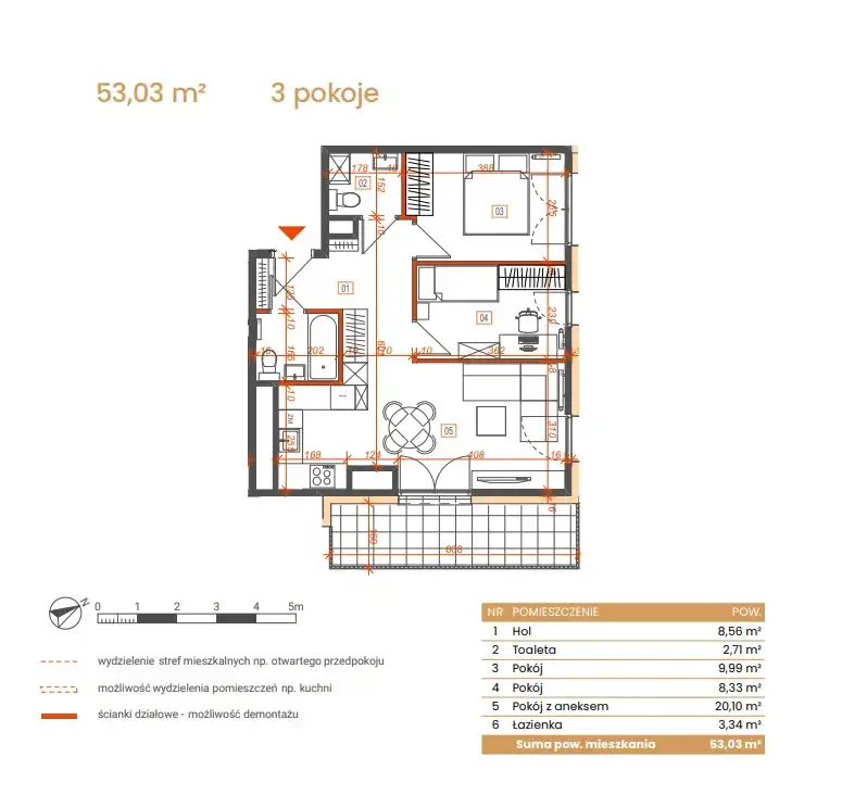 - Charakterystyka mieszkania 53.03 m2, 3 pokoje