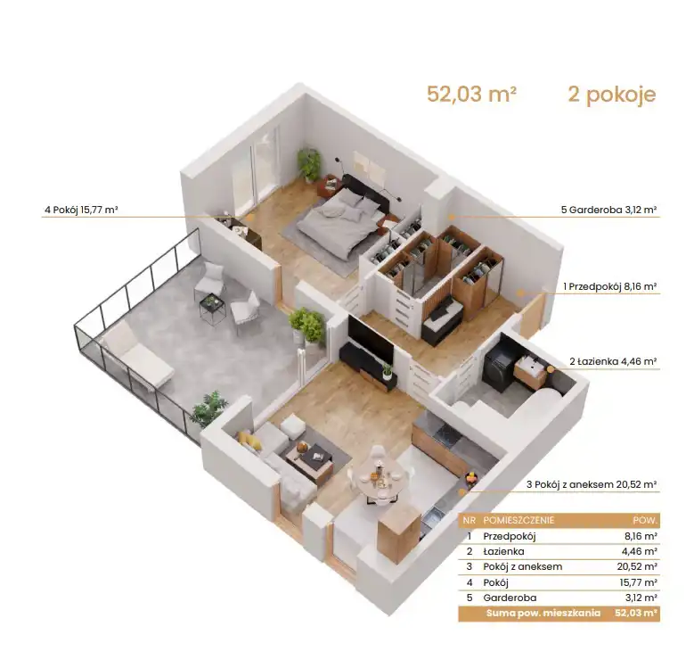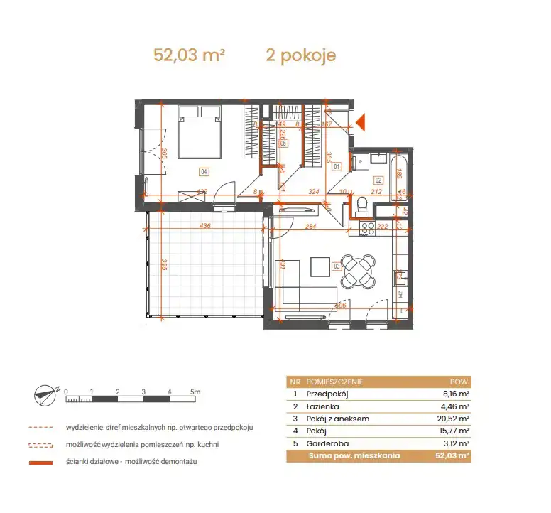 - Charakterystyka mieszkania 52.03 m2, 2 pokoje