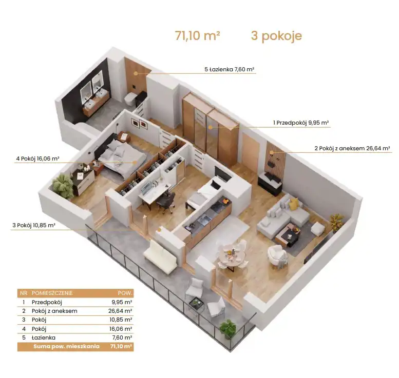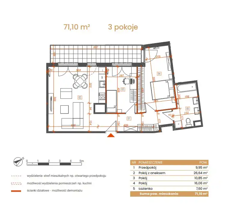 - Charakterystyka mieszkania 71.1 m2, 3 pokoje
