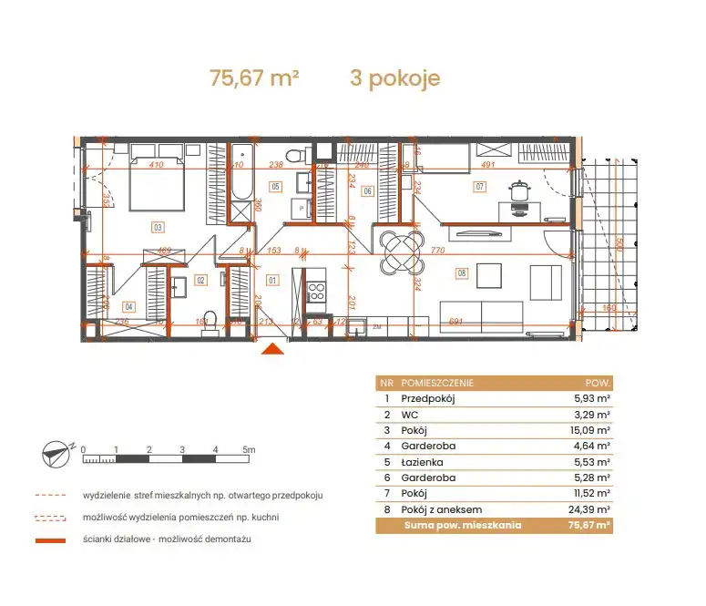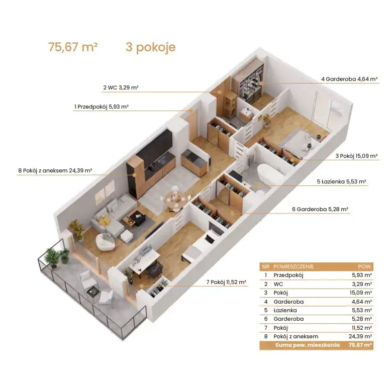- Charakterystyka mieszkania 75.67 m2, 3 pokoje