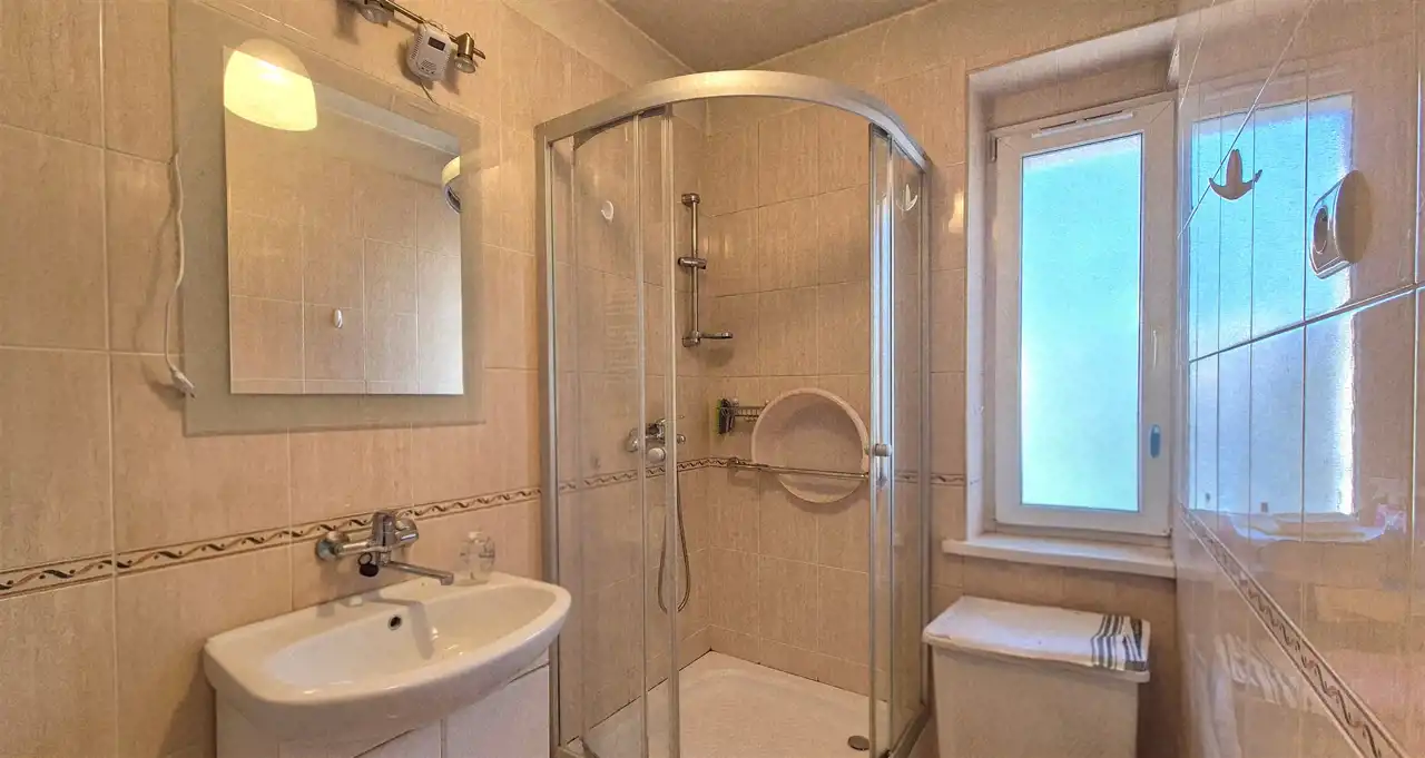 - łazienka z oknem wyposażona w kabiną prysznicową