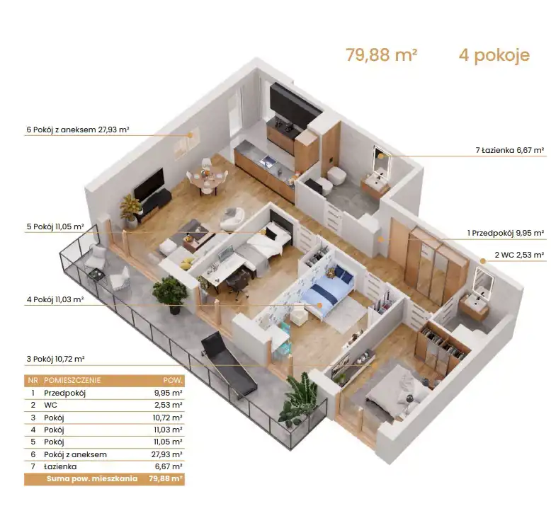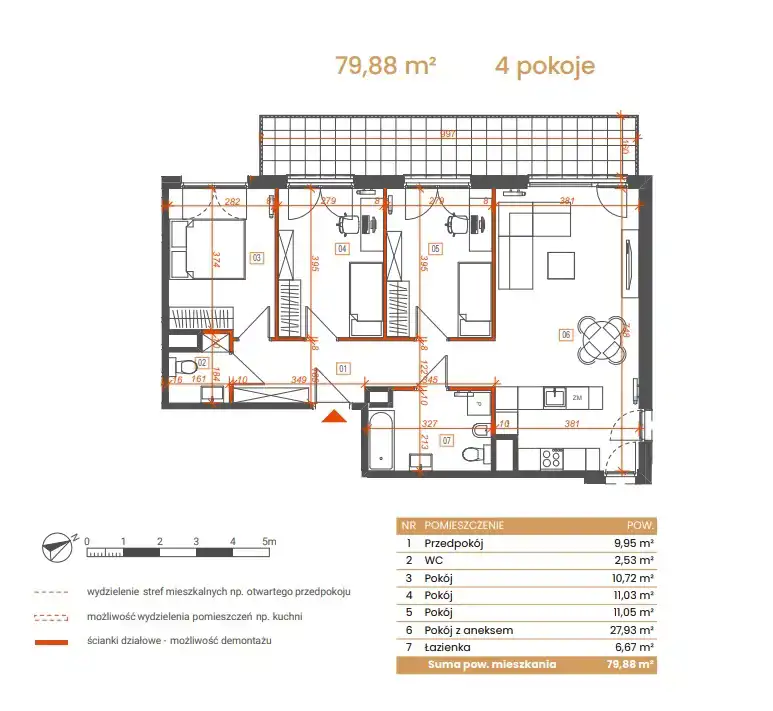- Charakterystyka mieszkania 79.88 m2, 4 pokoje