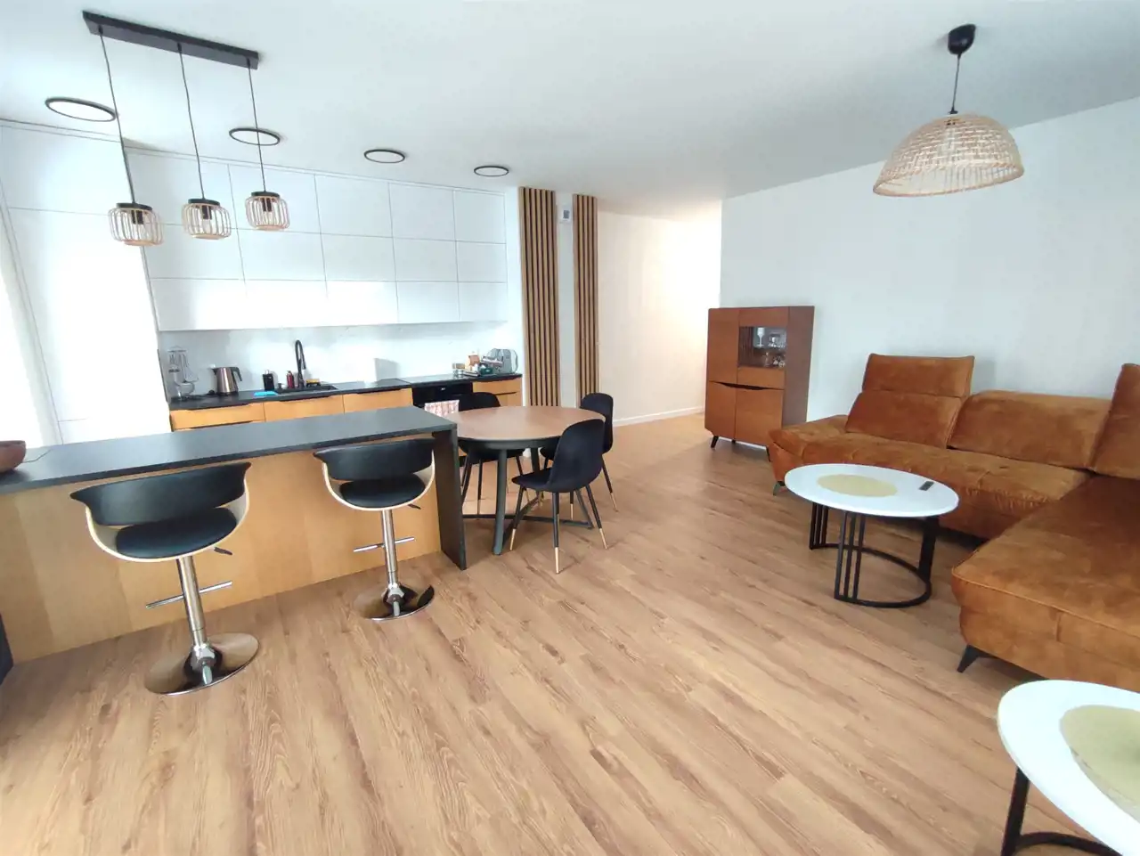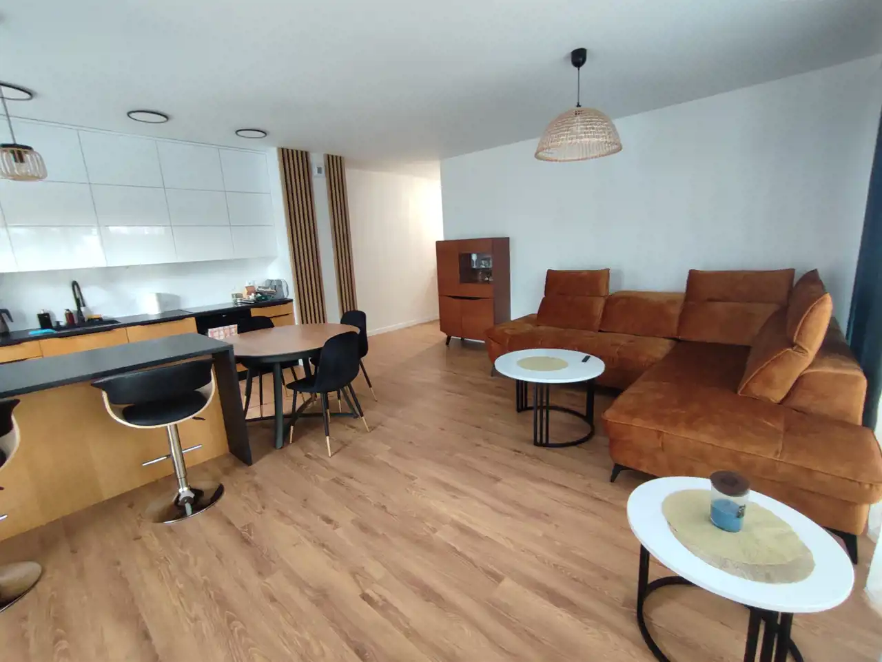 - w pełni wyposażonej części kuchennej połączonej z salonem