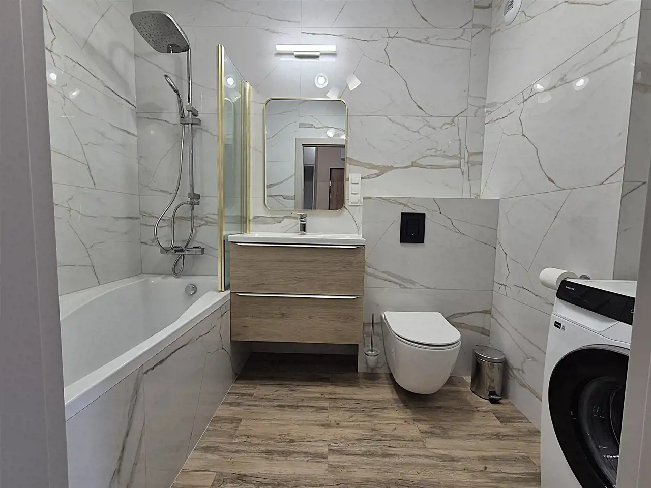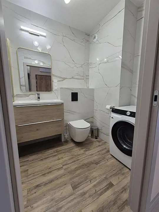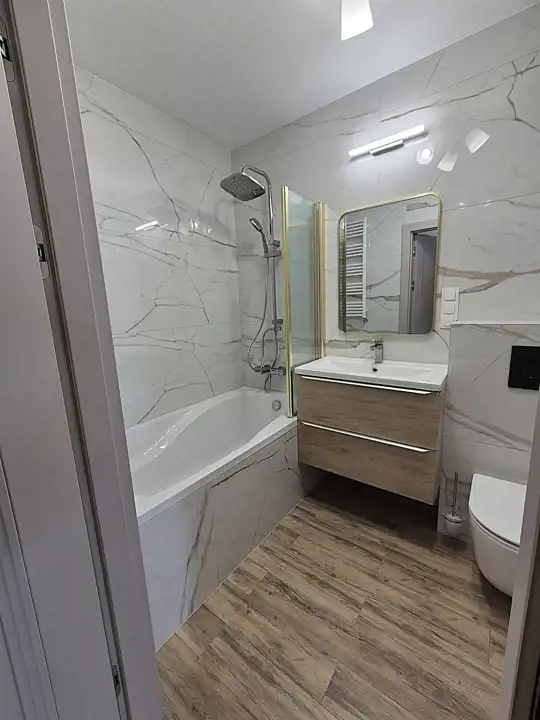 Łazienka razem z wc z wanną z możliwością prysznica, w pięknej kolorystyce.