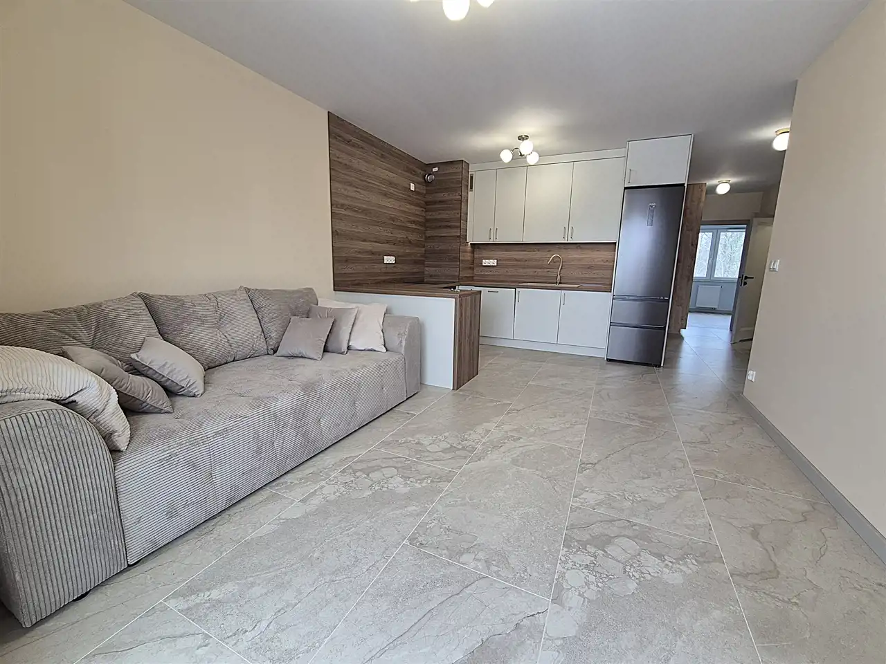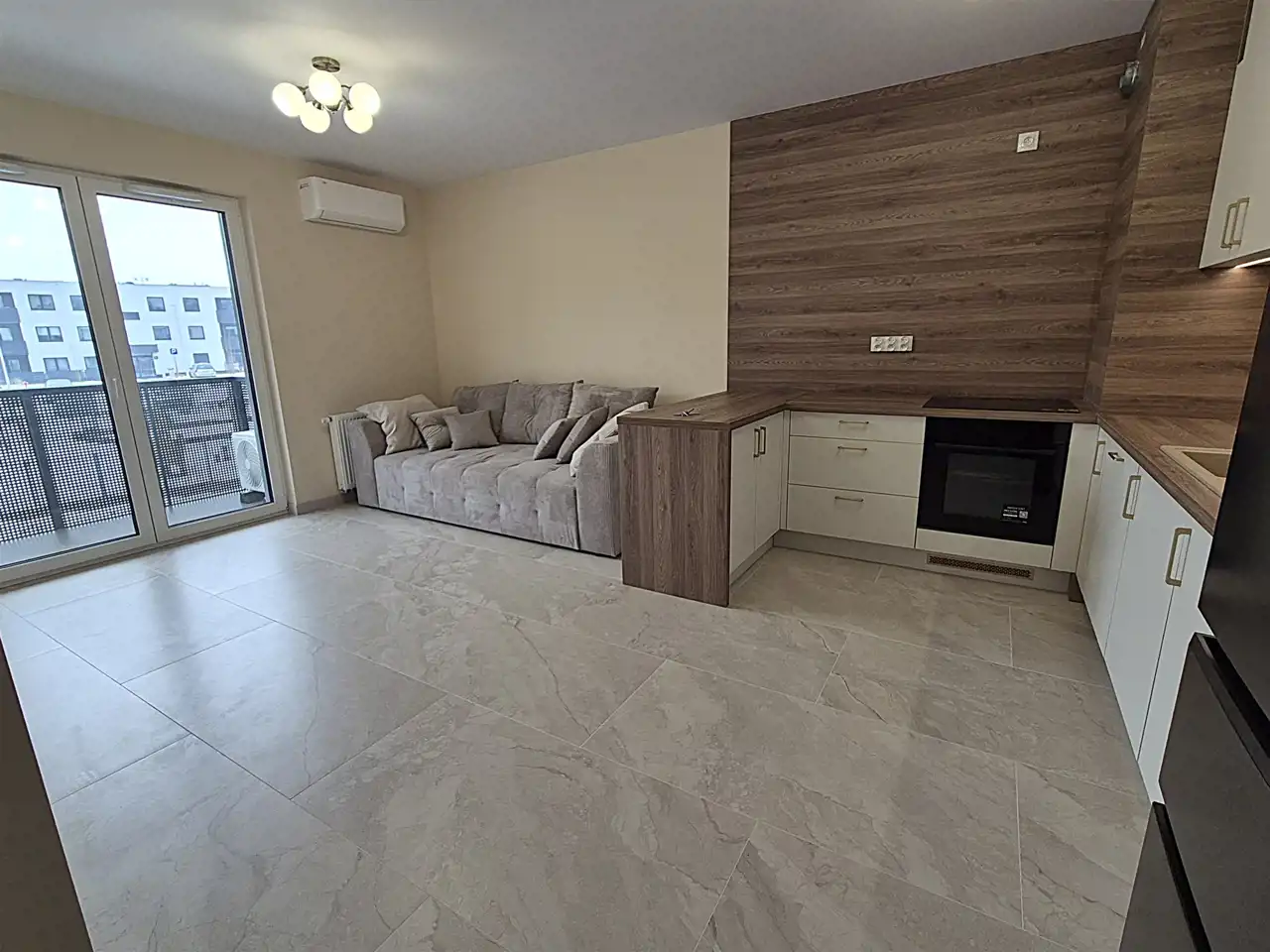 Salon z aneksem kuchennym z wyjściem na balkon, zamontowana klimatyzacja, wystawa okien wsch.
