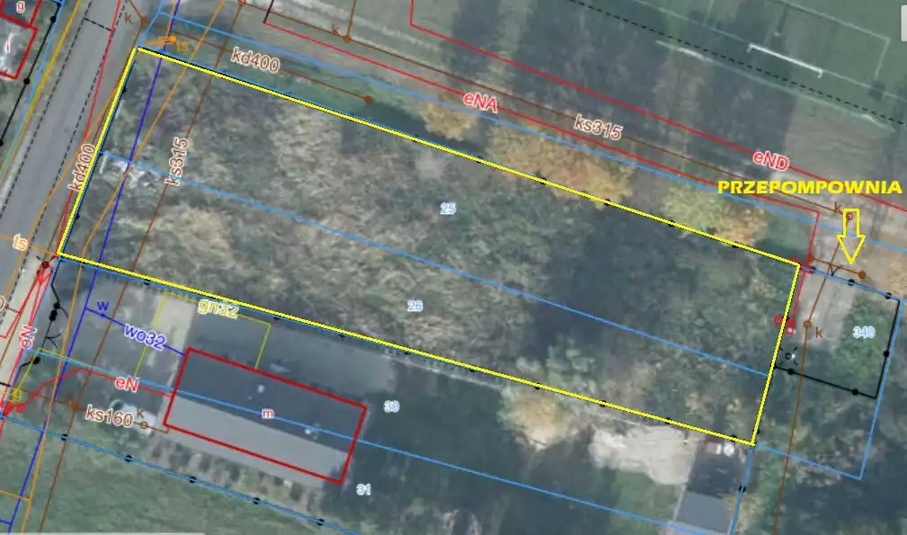 Tylna granica działki graniczy z terenem przepompowni wód opadowych i ścieków komunalnych.