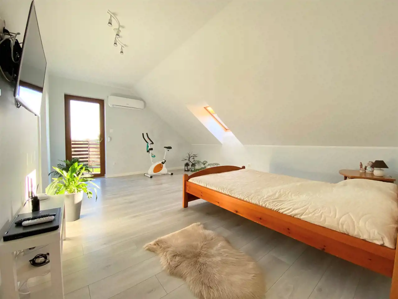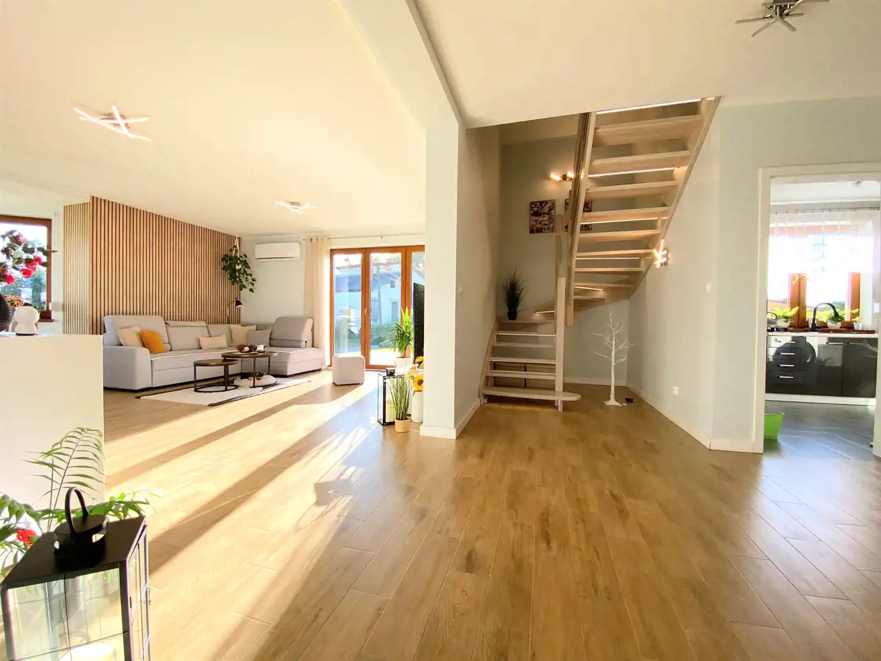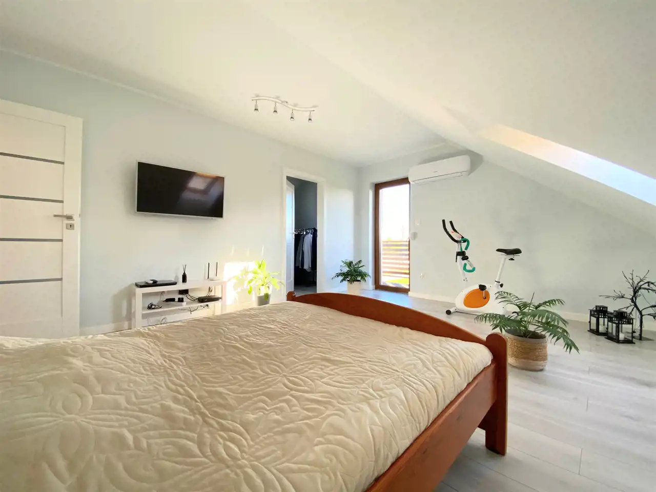 Dom ogrzewany kotłem gazowym zasilanym z sieci miejskiej. W salonie oraz w sypialni na górze zamontowana klimatyzacja. Okna 3-szybowe. W każdym oknie rolety zewnętrzne.