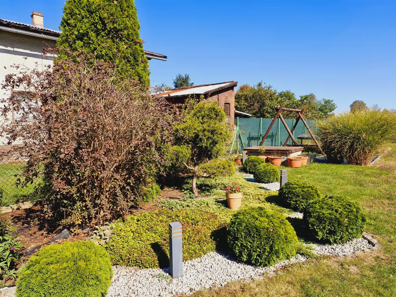 Budynek jest w całości podpiwniczony, co zapewnia dodatkową przestrzeń do przechowywania. Został także wyposażony w klimatyzację, gwarantującą komfort o każdej porze roku. Na terenie posesji znajduje się praktyczna wiata, a sam ogród jest oświetlony i posiada automatyczny system nawadniania, co czyni go idealnym miejscem do wypoczynku na świeżym powietrzu.