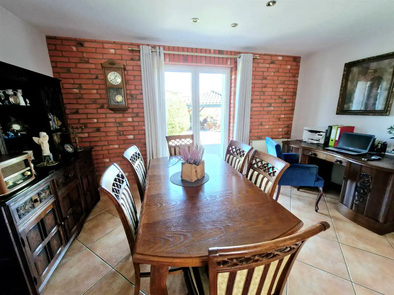Dom o starannie przemyślanej architekturze jest w pełni wyremontowany oraz ocieplony, a działka zagospodarowana z dbałością o detale. Na parterze znajduje się przestronny salon o imponującej powierzchni 40 m², który dzięki dużym przeszkleniom naturalnie łączy wnętrze z ogrodem i tarasem – idealne miejsce do wypoczynku. Obok znajduje się oddzielna, funkcjonalna kuchnia, zaprojektowana z myślą o codziennym komforcie. Dodatkowo na parterze do dyspozycji mieszkańców jest praktyczne WC oraz przestronny ganek.