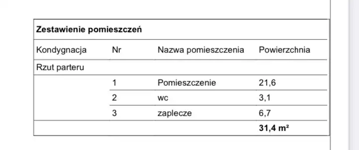 Tradycyjna technologia budowy, 1 kondygnacja bez podpiwniczenia. Przedmiotowy lokal składa się z pomieszczenia głównego o powierzchni 21,6 metry kwadratowe , pomieszczenia stanowiącego zaplecze z wodą i kanalizacją o powierzchni 6,7 metrów kwadratowych i oddzielnego WC o powierzchni 3,1 metrów kwadratowych.