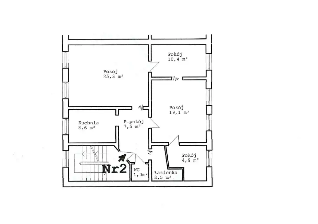 Lokal mieszkalny przy ul. Traugutta 10/2 na I piętrze dwukondygnacyjnego budynku wielorodzinnego o całkowitej powierzchni użytkowej 80.3 m2, na który składają się aż cztery pokoje mierzące kolejno: 25,3 m2, 19,1 m2, 10,4 m2 i 4,9 m2. Ponadto kuchnia o wymiarach 8,6 m2, łazienka 3,5 m2 i WC 1 m2