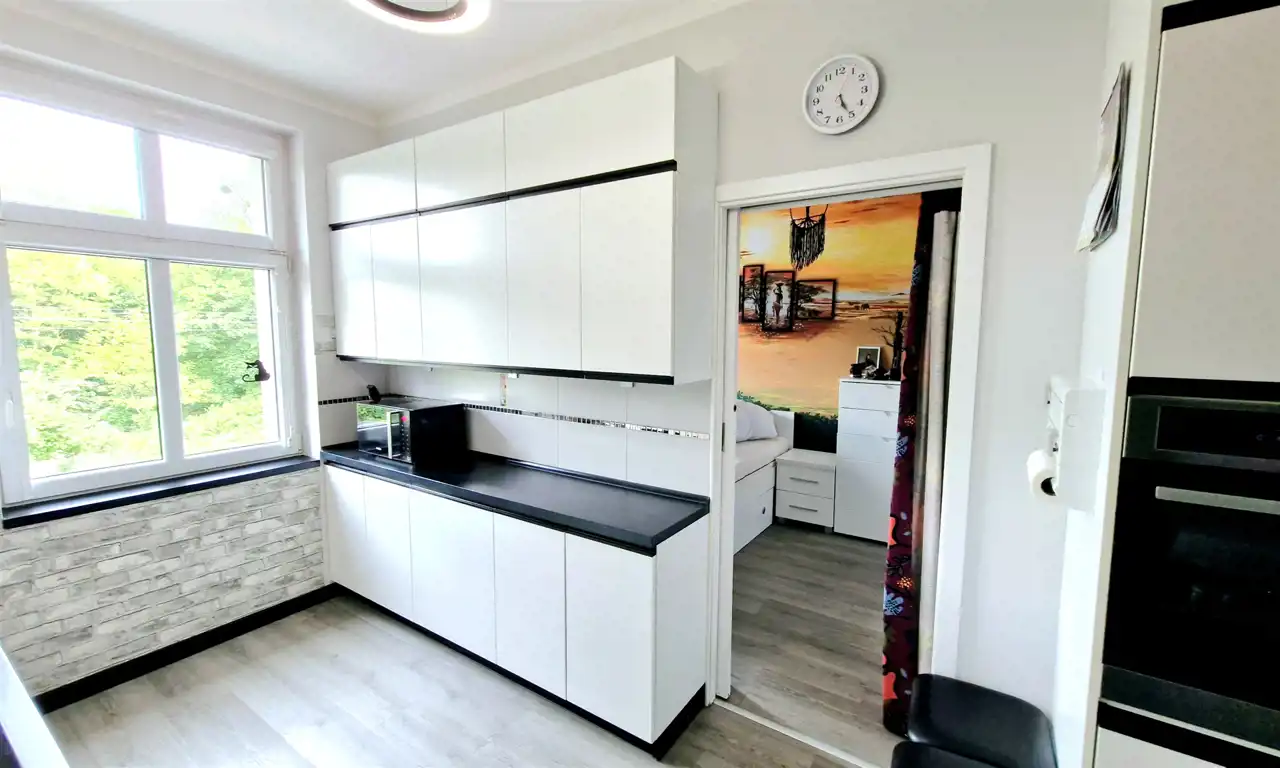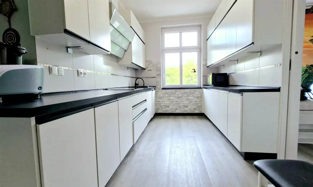 Całość została wykończona z dbałością o detale, w eleganckim, gustownym stylu. Mieszkanie sprzedawane jest z pełnym umeblowaniem, co stanowi doskonałą propozycję dla osób ceniących wygodę i gotowe do zamieszkania wnętrza.