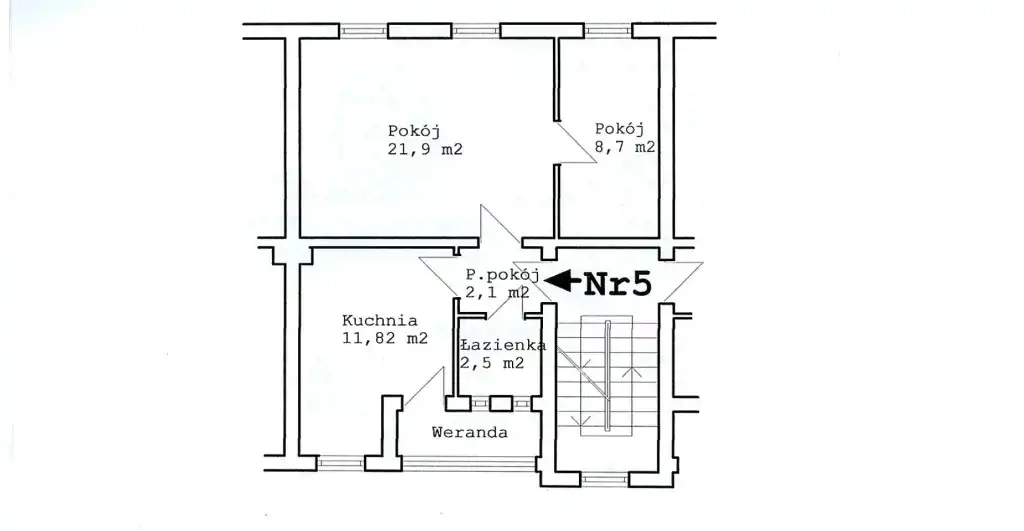 Mieszkanie na II piętrze trzykondygnacyjnego budynku wielorodzinnego o powierzchni 47,02 m2, w skład którego wchodzą dwa pokoje 21,9 m2 i 8,7 m2, przedpokój 2,1 m2, kuchnia 11,82 m2, łazienka 2,5 m2 oraz weranda.