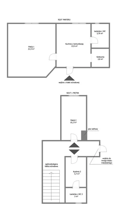 Na pierwszym poziomie (42,39m2), który znajduje się na parterze, wchodzimy przez klatkę schodową. Istnieje jednak możliwość stworzenia własnego, niezależnego wejścia bezpośrednio z ulicy, co zwiększa funkcjonalność i daje więcej opcji aranżacyjnych. Parter mieszkania obejmuje jasną i przestronną kuchnię z komunikacją o powierzchni 13,9m2. Duży pokój dzienny, o imponującej powierzchni 21,9 m2, stanowi centralny punkt tej kondygnacji i może pełnić funkcję salonu lub przestrzeni do pracy. Na parterze znajduje się również widna łazienka z WC o powierzchni 3,79 m2 oraz kotłownia o powierzchni 2,8 m2 wyposażona w piec na paliwo stałe, który zapewnia ogrzewanie oraz ciepłą wodę w całym mieszkaniu.
